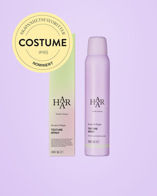 HAAR teksturspray er en lett spray som gir tekstur, volum og hold til håret. Påføres i røttene for å skape volum eller lengdene for tekstur. Kan også brukes på stylet hår for å gi hold til frisyren. Inneholder fuktighetsblokkere som forhindrer frizz og holder frisyren intakt i fuktige omgivelser. Den absorberer også lett olje fra hodebunnen, noe som forlenger følelsen av nyvasket hår.